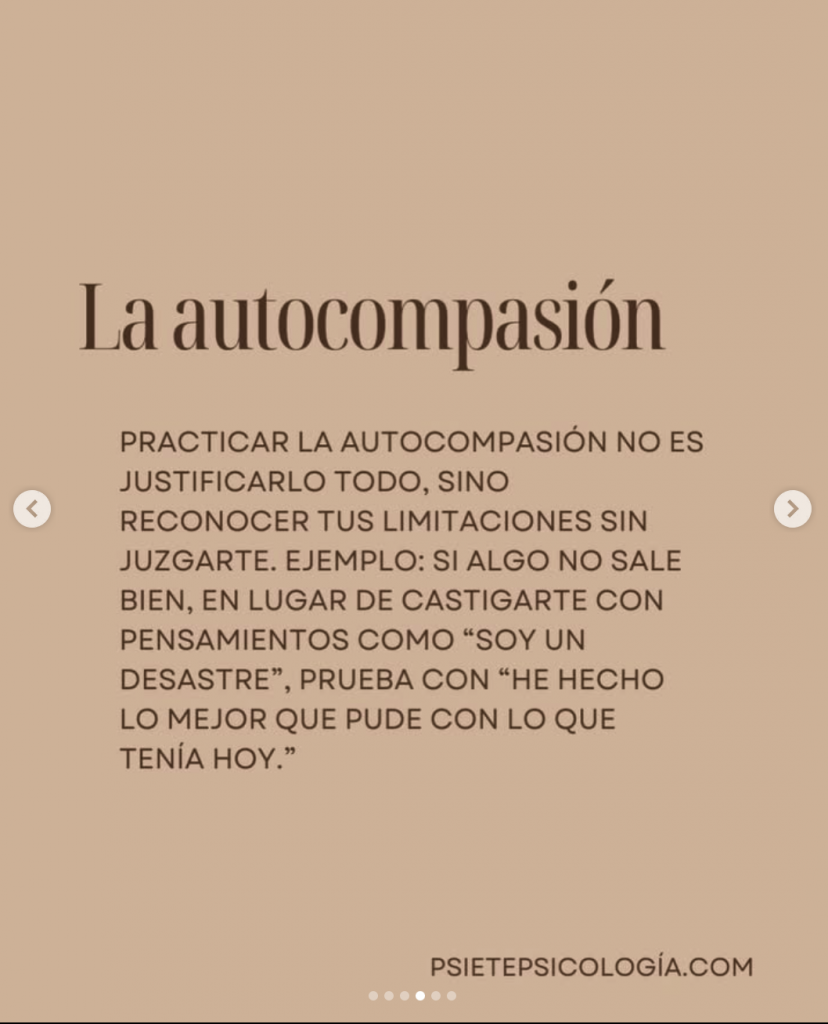 👉 Practicar la autocompasión no es justificarlo todo, sino reconocer tus limitaciones sin juzgarte. Ejemplo: si algo no sale bien, en lugar de castigarte con pensamientos como “Soy un desastre”, prueba con “He hecho lo mejor que pude con lo que tenía hoy.”